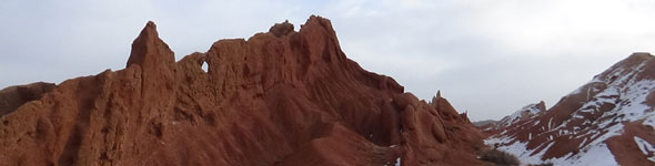 Situé à une trentaine de kilomètres de Bokonbayevo près du lac Issik Kull, le canyon de Skazka, également appelé le Fairy tale Canyon, se présente comme un dédale de collines colorées entre lac et hautes montagnes. La beauté des lieux fait l’objet de nombreuses légendes. Vous pourrez entre autre découvrir les crêtes surnommées « La Grande Muraille de Chine » en raison de sa ressemblance étrange avec celle-ci ; pour le reste, à vous de faire fonctionner votre imagination pour tenter de déceler, comme pour les nuages, des formes particulières. Vous pourrez aisément vous y balader au calme puisque celui-ci, malgré sa beauté saisissante, n’est pas encore très connu des guides touristiques. [Voir la vidéo]